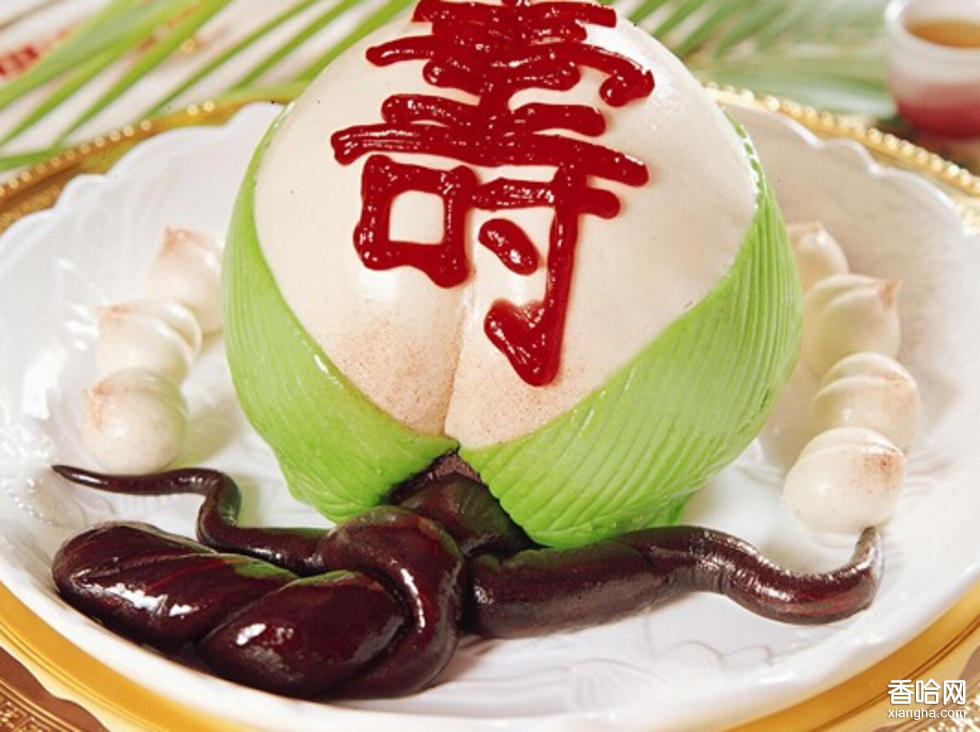 百子壽桃又叫百子鬧桃,是河南省漢族傳統(tǒng)名點,屬于祝壽食品。此桃剖開后,里面露出99個小挑,含有慶祝百子,百歲之意。選料嚴格,加工精細,技藝精湛,形狀美觀,莊重,味道香甜可口。