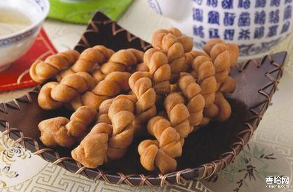 面粉加糖或鹽,經(jīng)兌料、打花、兌水、和面、切劑、揉條、下油烹炸制成。分甜、咸兩種。香甜酥脆,嚼后無渣,可放兩月不回潮,色澤金黃透亮。系景家祖?zhèn)?,已?00余年制作歷史。景家麻花又甜又香康熙皇帝品嘗后果然不錯。自此,列入御餐年年進貢景家麻花更名聲大振,生意興隆,代代相傳。