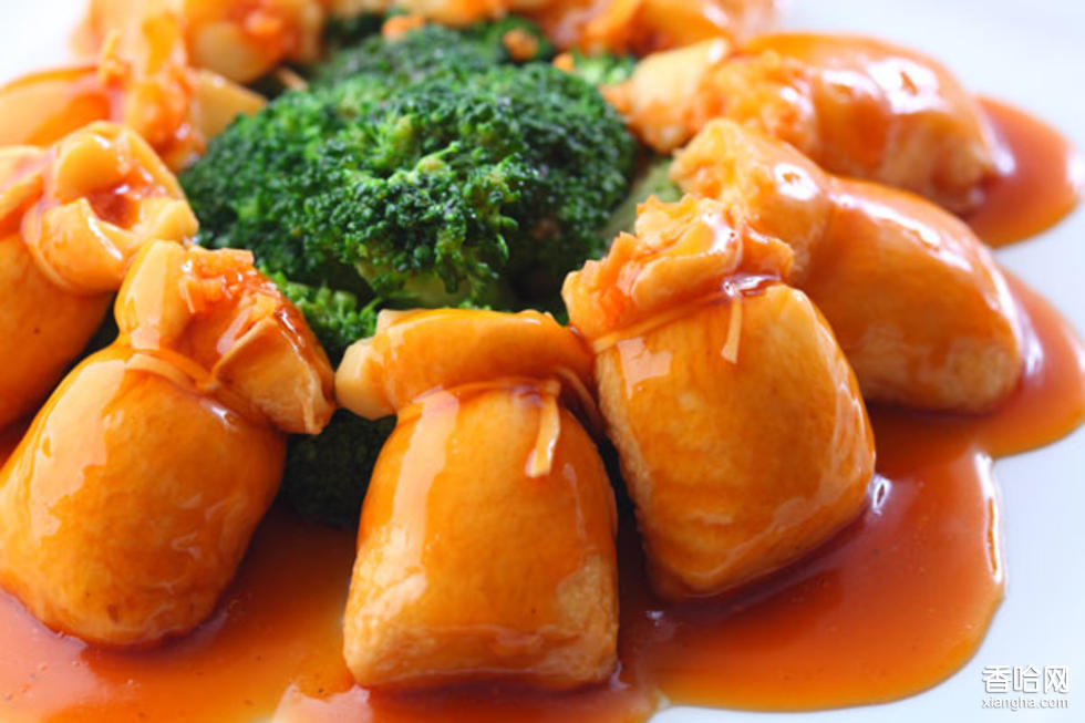 做法:玉脂豆腐炸過后鉆出空心,木耳、紅蘿卜、蝦仁、帶子切成極細(xì)的幼絲,釀入玉脂豆腐的空心中,用韭黃扎好開口處,便成了布袋狀的豆腐,入屜蒸熟,最后伴上冬菇和西蘭花,淋上鮑汁即可,配刀、叉食用。