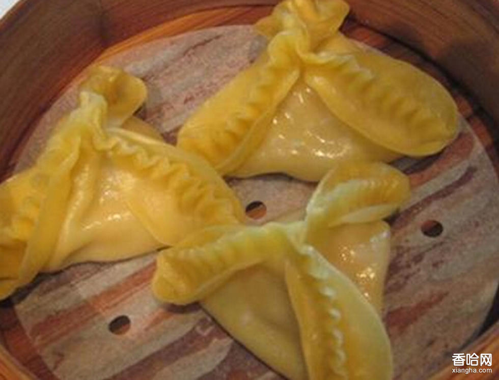 1.將干貝洗凈,去掉老筋,入籠用旺火蒸發(fā),取出后晾涼撕碎。香菇洗凈去蒂,切成末。熟火腿切成小丁。豬肉洗凈,剁成肉茸,盛入碗內(nèi),加入碎干貝、香菇末、胡椒粉、精鹽、味精、醬油、芝麻油拌勻,再加入骨清湯拌勻即成餡料。2.面粉過羅篩,放案板上,中間扒一小窩,加入溫水50克拌勻揉透,搓成細(xì)條,摘成12個(gè)劑子。逐個(gè)劑子搟成直徑約8.5厘米的薄圓皮,按三等份對折成角,將皮子翻轉(zhuǎn),光的一面朝上,中間放入肉餡15克,將三個(gè)角同時(shí)向中間捏攏,然后用食指和拇指推出花邊,將后面折起的面依然翻出,頂端留一小孔,填入火腿末,入籠蒸約10分鐘即成。