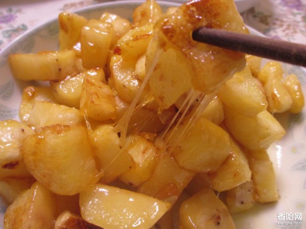 制作方法:1、山藥刮去皮切滾刀塊;冰糖碾碎成面兒。 2、勺內(nèi)注入油燒至五成熱,放入山藥至金黃皮脆里熟,倒入漏勺內(nèi)。勺內(nèi)留油少許,放入冰糖面和和一調(diào)匙清水,加桂花鹵熬糖,待糖汁表面的大氣泡變小,糖以開始變微微有點(diǎn)淺紅色時(shí),馬上將炸過的山藥倒入勺中攪動(dòng),用糖汁將山藥包均,倒入涂油的盤中,迅速上席即可。另上涼開水一小碗。
