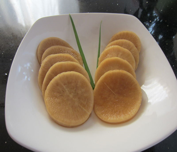 3、切白蘿卜片時(shí)不要切得太薄,太薄雖然易入味,但就不脆了。