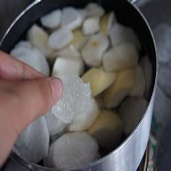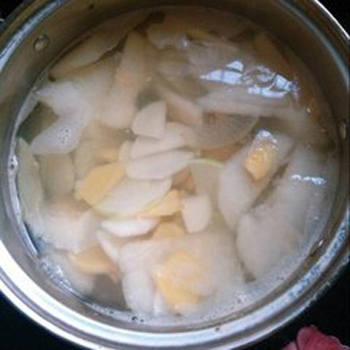 白蘿卜具有除痰潤肺、解毒生津、和中止咳的作用;梨具有滋陰潤肺、止咳祛痰的作用。最近天氣忽冷忽熱,許多人,尤其是老年人和孩子,無法適應(yīng)這種氣候,感冒咳嗽的人也多起來了?;颊咴谟盟幹委煹耐瑫r(shí),還應(yīng)注意配合適當(dāng)?shù)氖朝?,這樣才能盡快痊愈。此時(shí),可將白蘿卜梨湯作為患者的日常飲料,能起到緩解咳嗽的作用。中醫(yī)認(rèn)為,“脾為生痰之源,肺為貯痰之器”,是說咳嗽與人的脾胃具有密切關(guān)系,所以,調(diào)整脾胃可以對(duì)咳嗽起到很好的治療作用。白蘿卜具有消食、理氣、化痰的功效,能很好地調(diào)理脾胃。而梨具有潤肺清燥、止咳化痰的功效。因此,白蘿卜和梨配合,是咳嗽病人很好的輔助治療食品,即使是伴有發(fā)熱的病人,也可以食用。白蘿卜湯還可以預(yù)防咳嗽?,F(xiàn)代人由于營養(yǎng)過剩,不少人屬于脾虛濕盛的體質(zhì),尤其是經(jīng)常感冒咳嗽的兒童,典型表現(xiàn)為舌苔厚膩、大便不暢。而經(jīng)常服用白蘿卜梨湯,可以有效地調(diào)整人體的脾虛濕盛狀態(tài),減少感冒、咳嗽的發(fā)生。