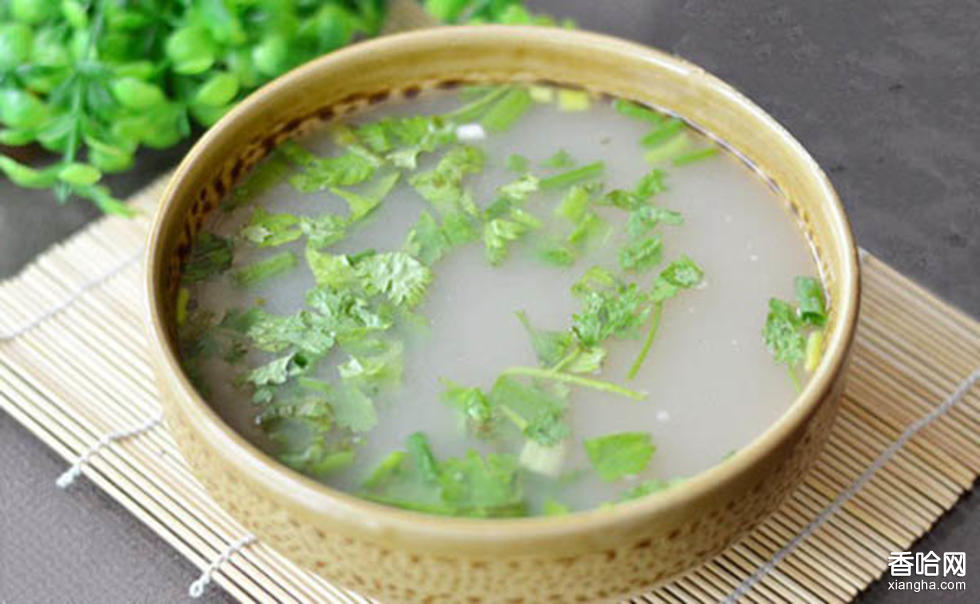 (3)制湯。鍋內(nèi)加水約5公斤,加入鮮羊肉湯,再依次放入粉皮絲、海帶絲、油炸豆腐絲和鹽,用大火燒沸,然后添些涼水使湯鍋呈微沸狀。將面筋拿起,雙手抖成大薄片,慢慢地在盆內(nèi)涮成面筋穗(大片的面筋用搟杖攪散)。鍋內(nèi)燒沸后,將洗面筋沉淀的面芡(將上面的清水瀝去)攪成稀糊,徐徐勾入鍋內(nèi),邊勾邊用搟杖攪動(dòng),待其稀稠均勻,放入五香粉、胡椒粉,攪勻,再撒入菠菜,湯燒開(kāi)后即成。食用時(shí)淋入香醋、芝麻香油。