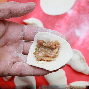 4、第三步:右手的拇指和食指用同樣的手法,以左手的食指和中指為依托,擠壓捏緊餃子的另一邊。