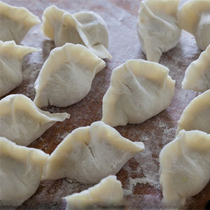 4、包餃子。鍋中燒開(kāi)足量的水,下入餃子,順鍋邊旋轉(zhuǎn)攪動(dòng),以防粘鍋,待餃子浮上來(lái),水沸后,淋上一碗涼水,蓋上鍋蓋,再次煮沸后再淋一碗涼水,共淋三碗涼水后,關(guān)火,出鍋。