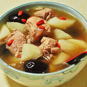 原料:山藥、紅棗、排骨、蔥段、姜片、鹽、雞精、枸杞