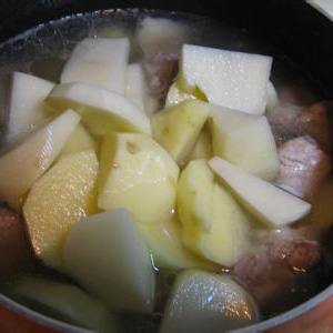 4、將排骨、蔥姜、紹酒和適量清水,上旺火燒沸,再小火燉至半熟時(shí),放土豆燉至熟爛,再加鹽、味精起鍋即可。