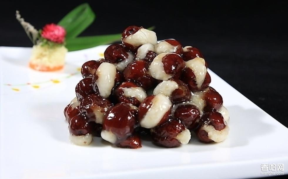 蜜汁金棗,是山東美食,用山藥泥包入棗泥餡制成棗狀,入油中炸透成金黃色,然后熬蜜糖汁,將炸好的金棗入鍋內(nèi)燜至汁濃,雖非真棗卻具有棗之神韻。此菜形似金棗,馥郁甘腴,較之真品更勝一籌。