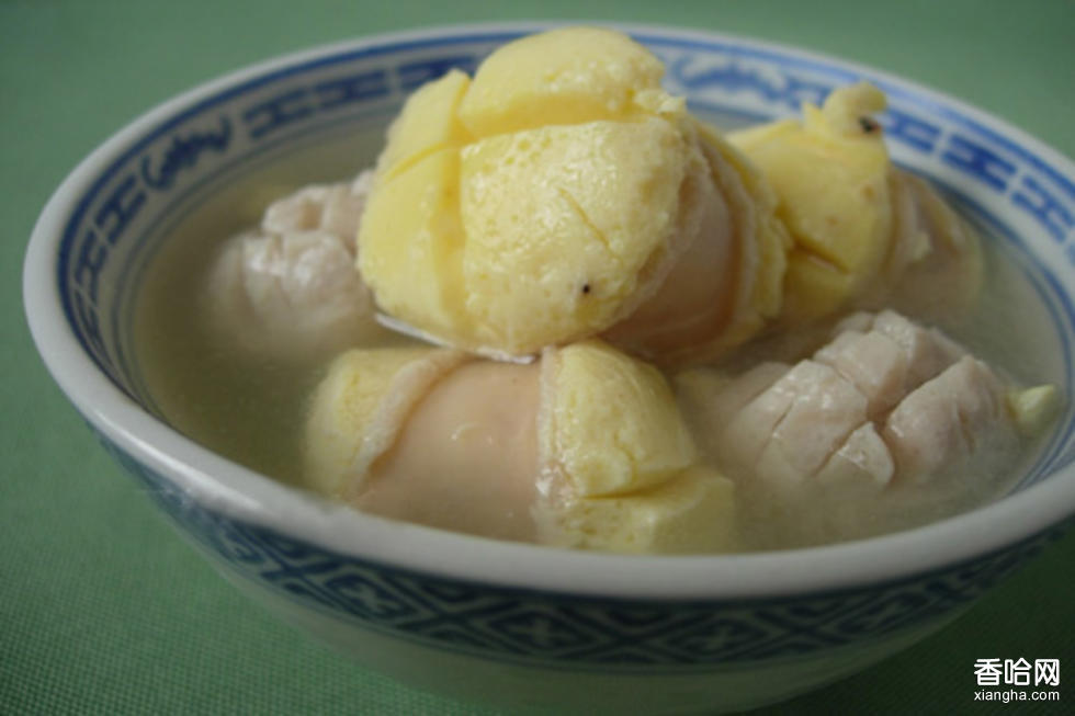 將雞蛋加少入許食鹽和適量溫水,用筷子反復(fù)打散,然后把豬腸一頭用線扎緊,將蛋從另一頭灌入,滿后用線扎牢。之后握蛋腸一頭的線,放在鍋中約50度的水內(nèi)來(lái)加擺動(dòng),待至水沸時(shí),立即將蛋腸取出,切成半寸長(zhǎng)的小段,備用。燒湯時(shí),將腸段投入,佐以香菰、紅菰等配料,加少許味精、食鹽、蔥花等,煮至蛋腸兩頭呈磨菰形時(shí),起鍋即成,清淡爽口,為宴客佳肴。