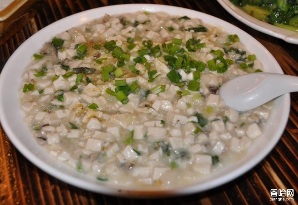 制作:先將豆腐切成細(xì)丁下鍋煮透后放鹽,再把肉蓉和大米粉投入調(diào)成稀糊狀,然后切碎筍干、菊花菜下鍋。稍頃,放入香菇丁、姜末、味精和食油等佐料調(diào)勻后出鍋。裝盤(pán)上席時(shí)再撒放一點(diǎn)香麻油、蔥花、胡椒粉即成。