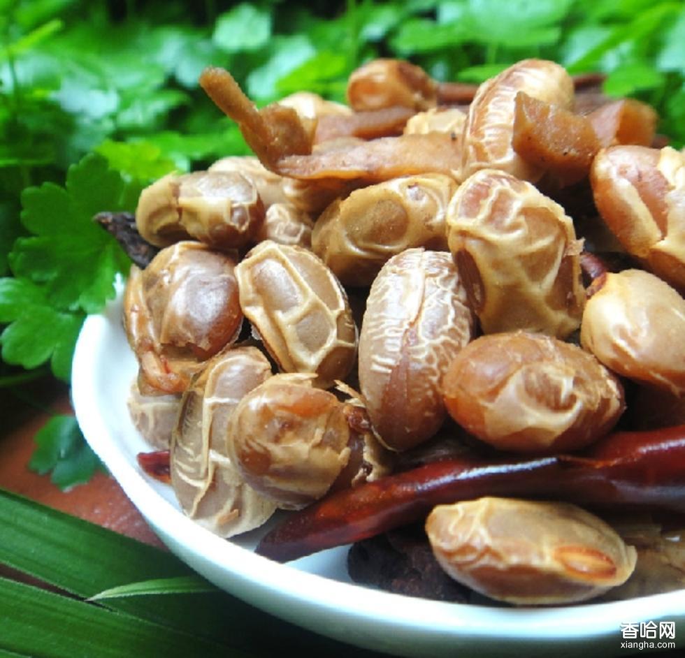 五香筍豆,是江西上饒的傳統(tǒng)小吃,選取顆粒飽滿(mǎn)的黃豆為原料,細(xì)細(xì)地洗凈,加上各種香料,如桂皮、八角茴、竹筍等,用小火慢慢地?zé)?,快收干時(shí)加食鹽、醬油。加上了各種香料煮熟了的豆子,在太陽(yáng)底下曬過(guò),因?yàn)閮?nèi)里縮小而外皮卻膨脹了,那微微有些皺皺的模樣,就好像老虎身上的條紋。所以被形象的稱(chēng)為虎皮豆。