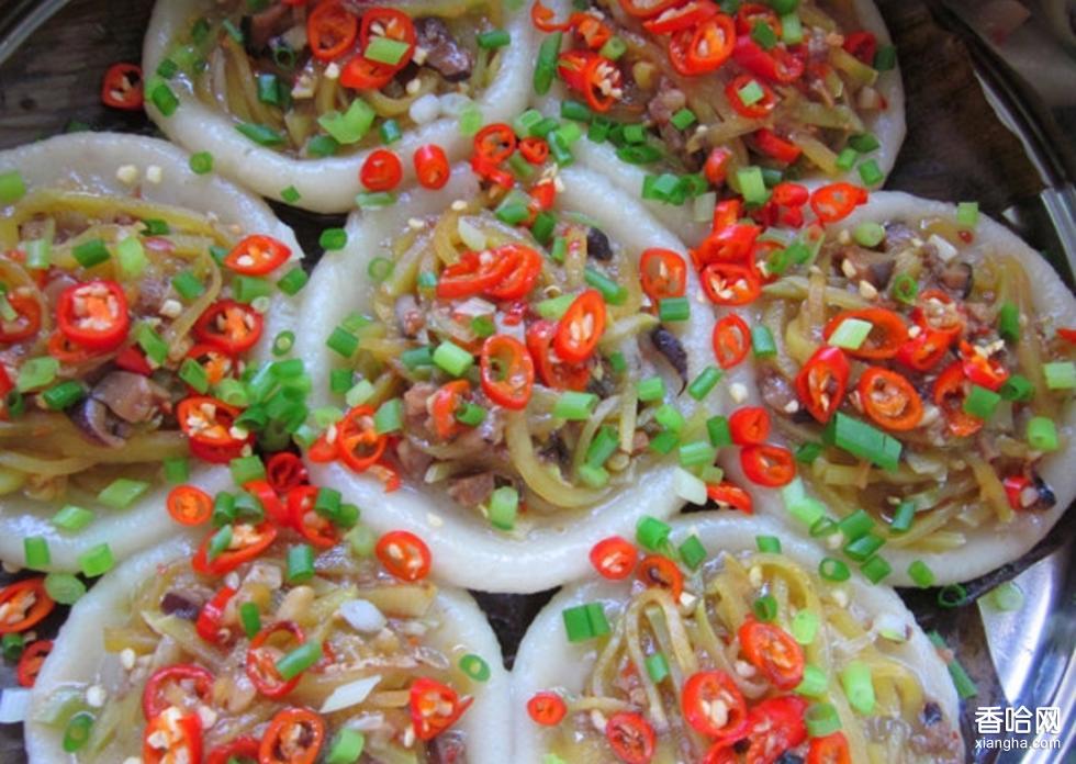 說(shuō)蒸汽糕可能并不是那么被人們所知道,但從它身上衍生出來(lái)的另外一個(gè)名字相信大家很熟悉——發(fā)糕,兩者有異曲同工之處。在江西,這種叫“蒸汽糕”的小吃是婺源的特色小吃,甚至婺源周邊的縣市也有食汽糕當(dāng)早點(diǎn)的習(xí)慣。蒸汽糕以秈米泡發(fā)后磨成濕米漿,添入水發(fā)粉或米酒曲發(fā)酵后,隔著熱水在類(lèi)似鍋蓋的圓面板上抹成薄薄的一層,然后撒上香菇沫、蝦米、豆芽沫、干筍、干豆角、辣椒、蔥、豆腐干沫等。蒸熟后起鍋,厚度約1厘米,在上面撒上蔥花,澆上熟油,再用刀劃成棱形,蘸上辣醬就可以吃了。