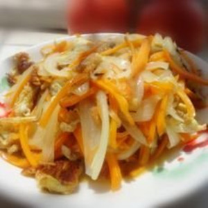 2、往鍋內(nèi)倒入適量的油,待油燒熱后,即放入洋蔥絲、紅蘿卜絲一起爆炒至八分熟。
