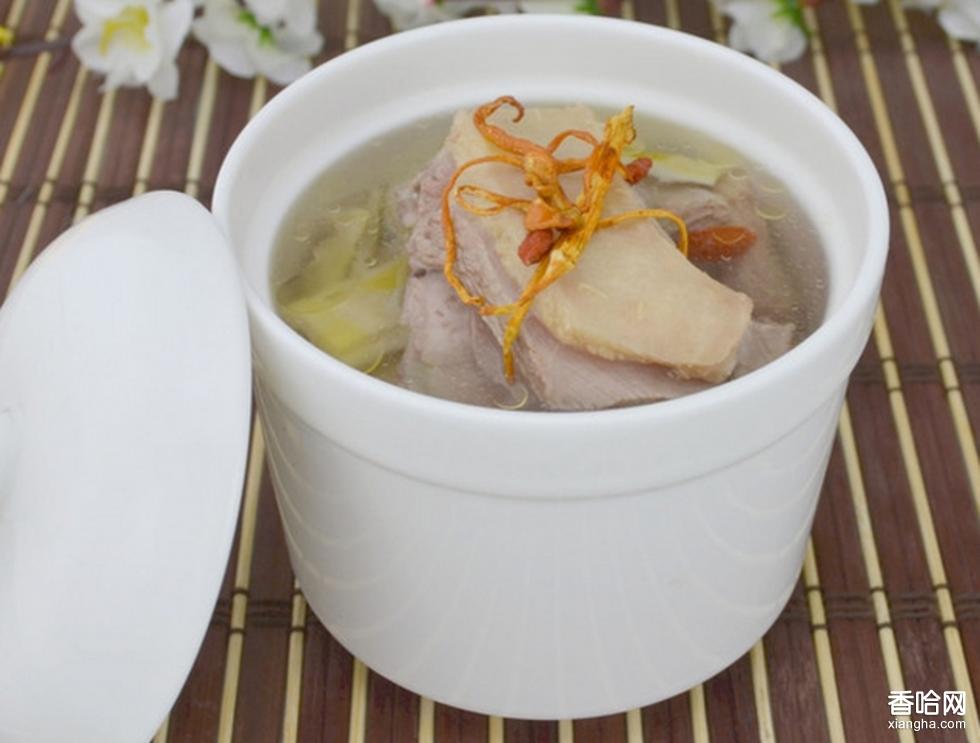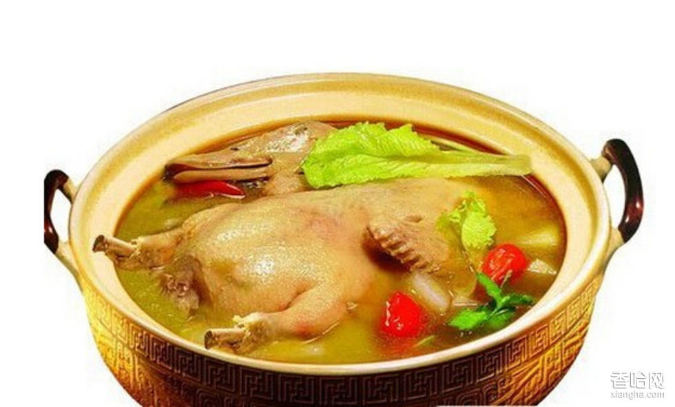 用白鴨和冬蟲夏草燉制而成。成菜湯汁濃醇,肉質(zhì)酥爛,香而肥鮮,富有營養(yǎng)。工藝:將白鴨宰殺,治凈,入沸水鍋中略焯取出,除去血沫,放入瓦缽或砂鍋內(nèi),加洗凈的冬蟲夏草和澤蘭、姜塊、蔥結(jié)、紹酒、清水,燒沸后,轉(zhuǎn)用小火燉,至鴨肉酥爛,湯汁濃醇即成。