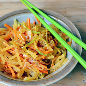 媽網(wǎng)提醒:用加了醋的清水泡過之后,土豆絲不但不會(huì)變色,還能保持脆嫩哦!