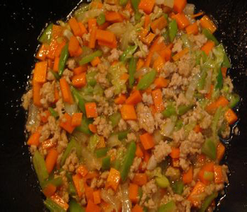4、肉餡變色后,倒入胡蘿卜翻炒;