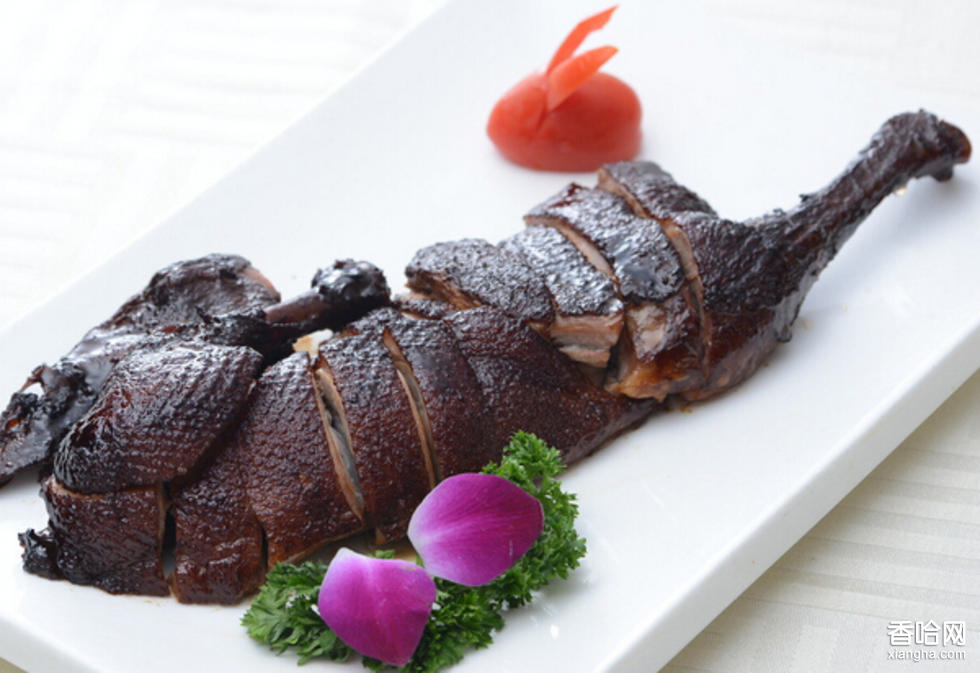 3、鍋內(nèi)放水,用旺火燒開,將整只鴨放到沸水中燙至鴨皮收縮崩緊,即拎起拔去肛門處竹簽,掛在風(fēng)口處,然后將腿胯間骨關(guān)節(jié)折斷。用濕布將鴨全身擦一遍,擦去皮衣,使鴨坯油亮光潔。