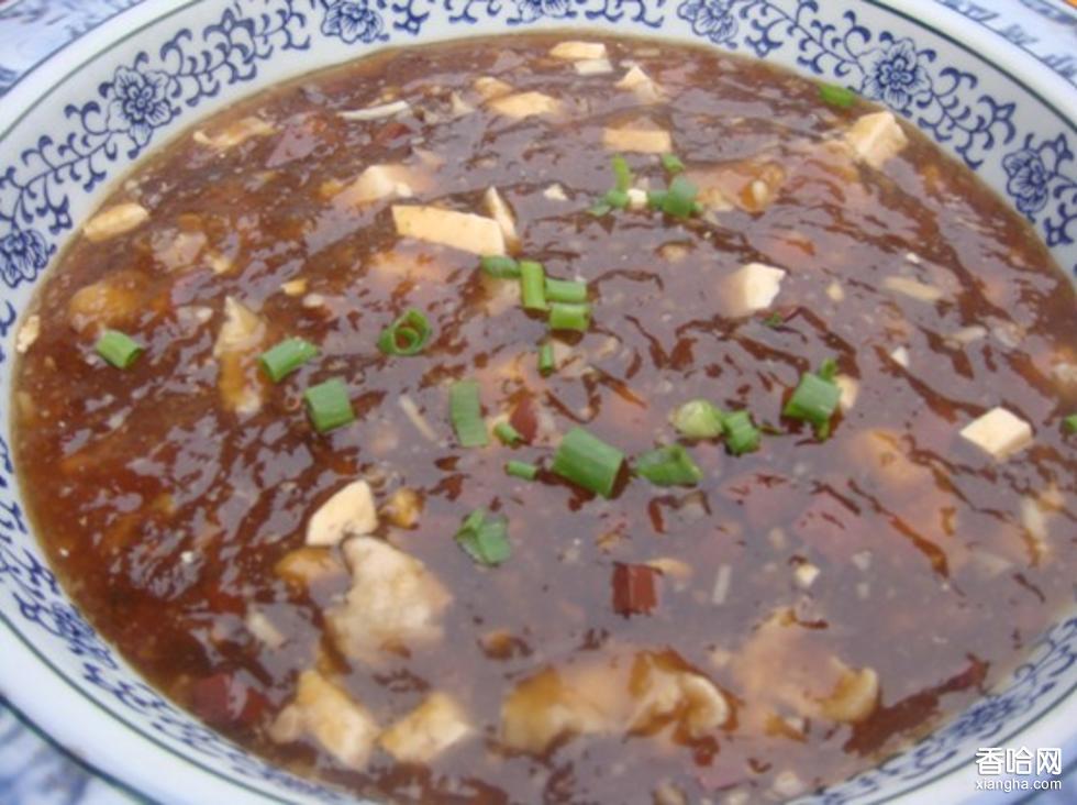 鍋內(nèi)下豌豆、筍丁、香菇丁、豆腐丁等時鮮菜蔬(視家庭條件和個人口味靈活掌握)翻炒幾下后,加水和高湯,起大火將水燒至沸騰,下敲好的肉餅,然后倒入事先調(diào)好的番薯粉芡汁,邊倒邊攪拌,使之均勻分布,不粘鍋底焦糊。再旺火滾上片刻,撒上香蔥、香菜等,狀似瓊脂,色如琥珀,肉質(zhì)脆嫩,鮮香滑爽的敲肉羹便可一一上桌待客了。