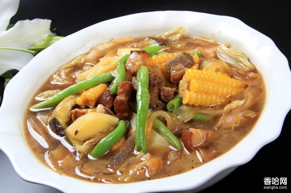 殺豬菜,原本是東北農(nóng)村每年接近年關(guān)殺年豬時(shí)所吃的一種燉菜。在東北許多地方常年開設(shè)殺豬菜,形成東北飲食一大特色。過去,在農(nóng)村殺年豬是一件大事,無論哪家殺年豬都必定要把親朋好友請到家里來吃殺豬菜。地道的“殺豬菜”,是由多種菜品組合成的系列菜的總稱?!皻⒇i菜”在保持原風(fēng)味的同時(shí),其制法已經(jīng)有了改進(jìn),口味豐富,幾乎把豬身上所有部位都做成了菜。豬骨、頭肉、手撕肉、五花肉、豬血腸、酸菜白肉還有“燈籠掛”;另外真正講究的菜館都選取農(nóng)村用糧食、豬草圈養(yǎng)而形成的“笨豬”,這種豬才有最純正的天然肉香。