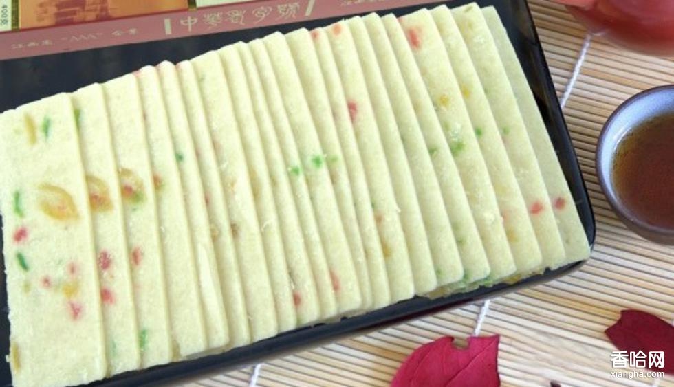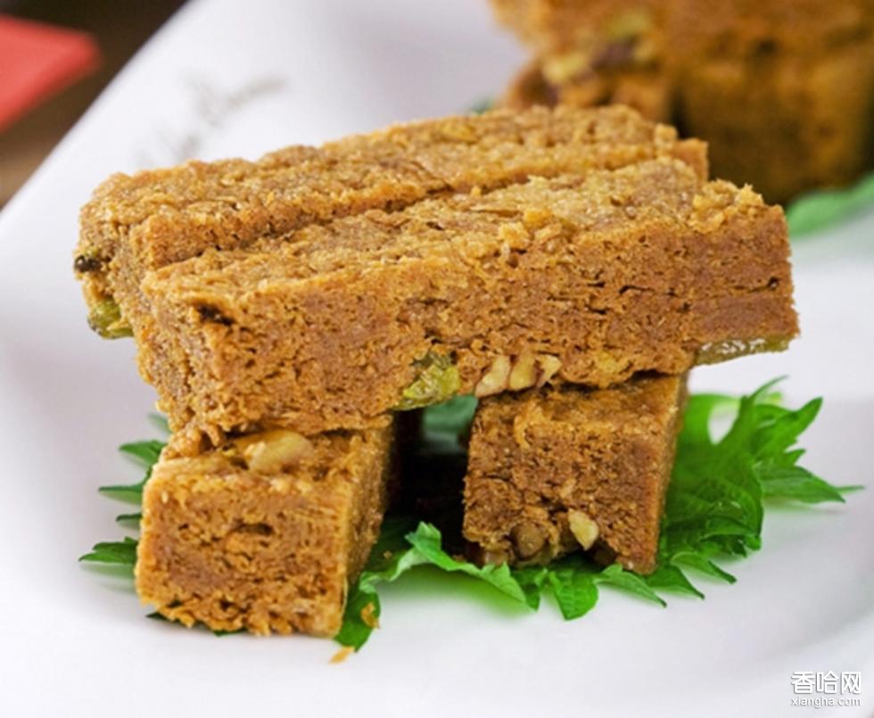 玉帶糕是安徽省漢族糕類名特產(chǎn)品,做工講究,質(zhì)量上乘。清朝乾隆年間,一品玉帶糕作為貢品,乾隆皇帝品嘗后嘖嘖稱贊,御封為“一品玉帶”,此后聲名遠(yuǎn)揚(yáng)。玉帶糕以冰糖、桃仁、紅梅、青梅、桂花、蓮子、桔餅、米粉、麻油為原料,經(jīng)科學(xué)方法,采用傳統(tǒng)工藝精制而成。黃色的核桃似黃金,綠色的青梅似翡翠,蓮子和桔餅如同珍珠瑪瑙;四周有米粉鑲成的白邊,酷象一條玉帶。玉帶糕不僅香甜可口,而且具有滋陰強(qiáng)身、潤腸益氣、清炎健胃、生津潤肺等功能。