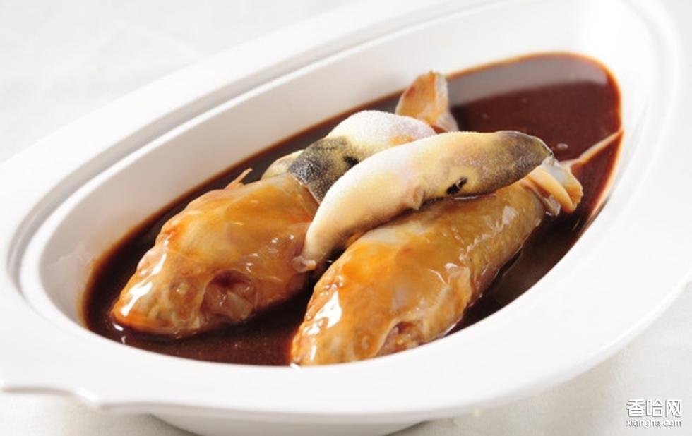 紅燒河豚是江蘇省漢族名菜,因鎮(zhèn)江盛產(chǎn)河豚。哧鮮甜,肉肥嫩,汁濃醇。將河豚眼睛、內(nèi)臟、鰓全部去凈,血水嚴格漂洗凈至清為止。炒鍋上火燒熱,入油、蔥結(jié)、姜片煸香,入河豚、五花肉、鮮筍片煸透后烹紹酒,入醬油、綿白糖,加入河蚌、火腿、蟹黃油、母雞、五花肉吊制的膏湯,入蝦籽、精鹽,大火煮沸,小火燜透后收稠湯汁裝盤。