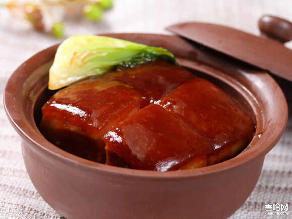 制作方法:將帶皮五花肉切成方塊,每塊肉上剞十字刀紋。將肉塊放入清水中煮至五成熟時撈出。將鍋底放一層姜片,將肉塊擺上沙鍋內(nèi)(皮朝上)。肉上面放筍片,加料酒、醬油、冰糖、清水,先用旺火煮沸,再用小火久燜2小時,至肉酥爛味透時加入味精起鍋裝盤,肉皮朝上。將炒熟的菠菜放入肉盤的兩端,兩邊擺上蒸熟的荷葉夾,撒上蔥花、胡椒粉即成。