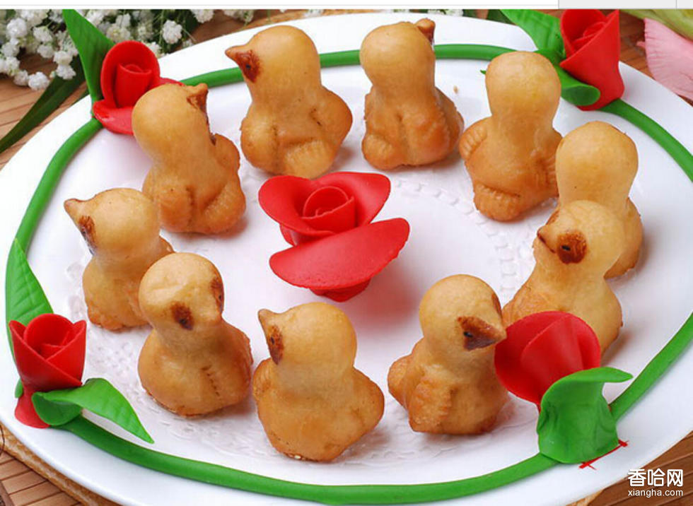 制作方法:1. 面粉1份加植物油少許,摻水揉成水皮面; 2.另一份加豬板油揉成油面; 3.水皮面包入油面搟成卷起,包入豆沙捏成小雞狀;4. 黑芝麻點(diǎn)眼,刷蛋黃液入烤箱烤12分鐘即成。