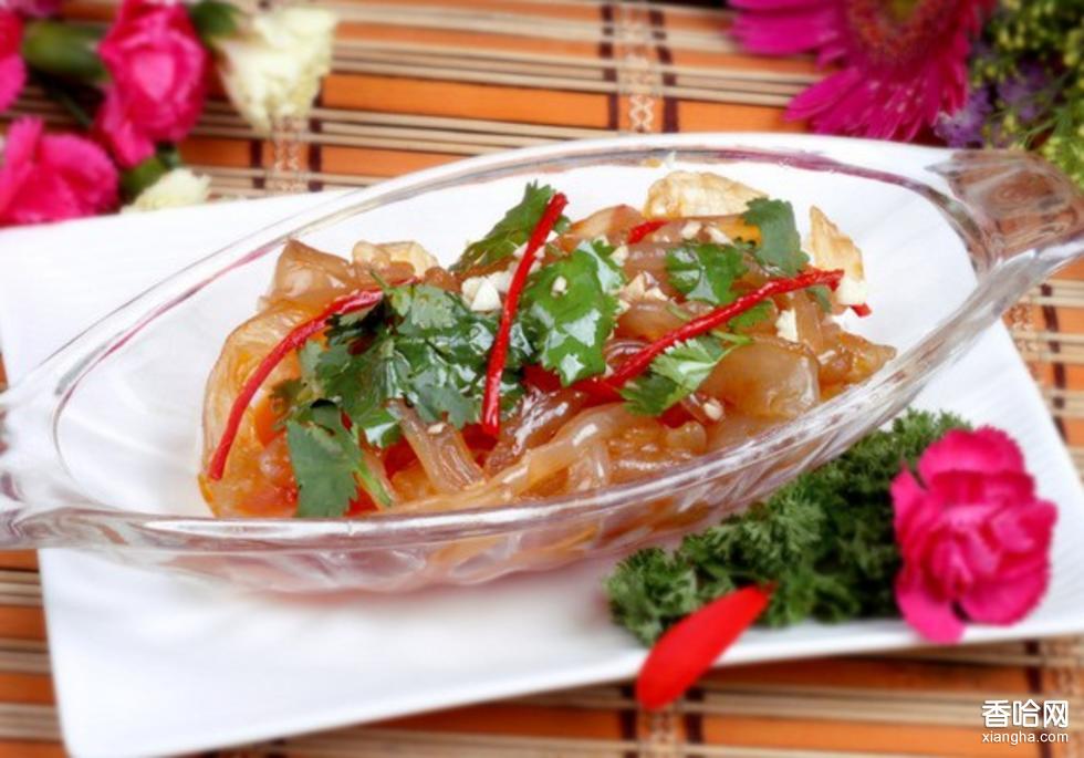 取海蜇皮,放入清水浸泡4-8小時(shí),再充分洗除,而后切成細(xì)絲,用冷開(kāi)水洗滌1-2次,把海蜇絲的水盡量擠干凈,放在盆內(nèi),加入適量的醬油、醋、白糖、麻油和少許味精調(diào)味,充分拌勻,即可食用。氽海蜇的水要多,火要旺,動(dòng)作要迅速,否則嚼而不爛。