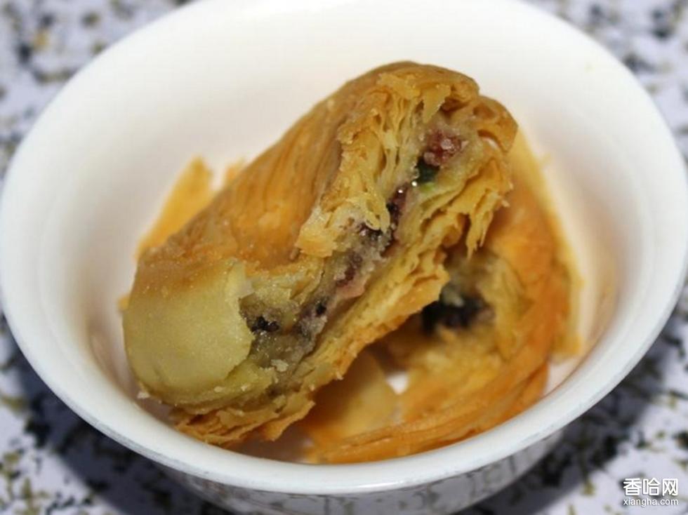 制作方法:1.制皮:先將水、油、糖攪拌均勻,再加入面粉制成均勻、光滑的面團,蓋布回餳。2.制酥:將油、面拌勻。3.包酥:按皮95克、酥55克進行小包酥,經(jīng)搟、折包好后,卷成長條備用。4.制餡:將白糖、豬油在一起拌勻、擦透,然后將各種小料切碎擦拌均勻即可。5.包餡:將包酥后卷成的長條,順長切成兩半,作成明酥,刀口切面向上,按扁后搟成圓片,包入餡心。包好后每只重125克,用手拍成直徑7厘米的圓坯即可。6.炸制:將生坯放在鐵篩內(nèi),留一定間距,放入130℃熱油中,炸至外殼發(fā)硬,表面呈淡黃色即可。