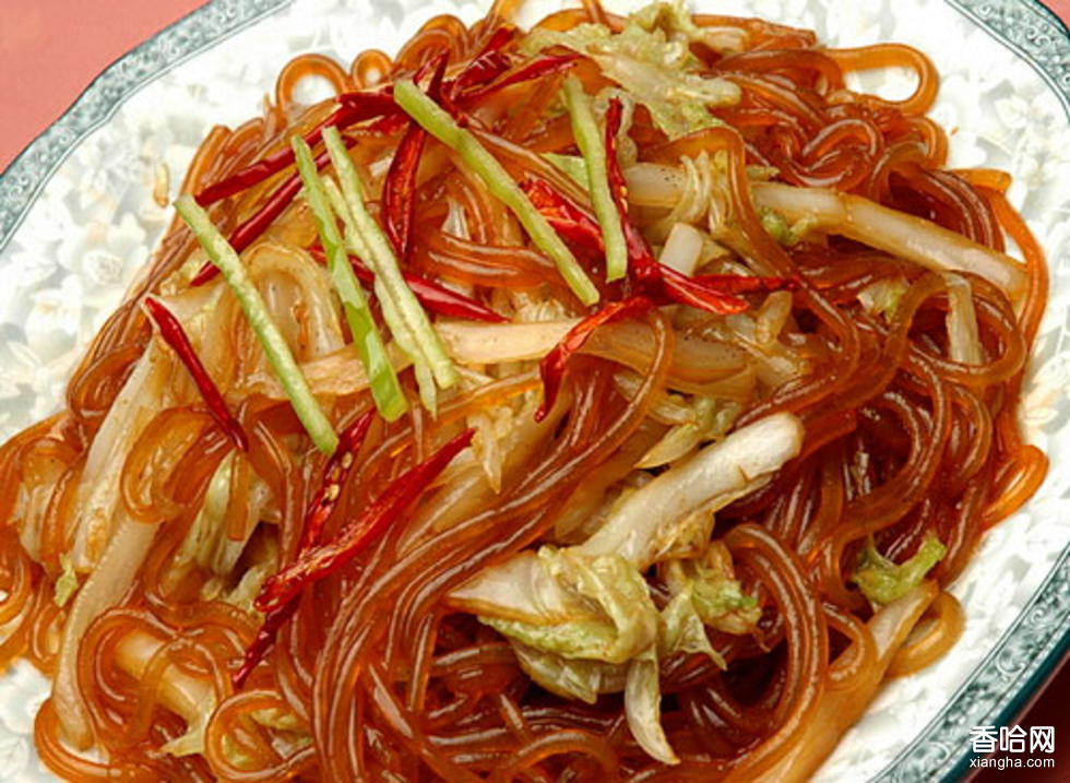 漬菜粉絲 漬菜(酸菜)是北方特有的菜肴,是由白菜浸泡發(fā)酵腌制而成,具有酸脆清爽去油膩的特點。炒漬菜粉絲時要旺火,熱鍋熱油,小料和主料要同時下鍋,最后放調(diào)料,是原料浸透入味,操作的時候要快捷,防止出湯。酸白菜中的乳酸能開胃提神、醒酒去膩,還能增進食欲、幫助消化,可以促進鐵元素的吸收。粉絲里富含碳水化合物、膳食纖維、蛋白石、煙酸和鈣、鎂、鐵、鋁等礦物質(zhì)。粉條有良好的附加性,它能吸收各種鮮美湯料的味道,再加上粉條本身的柔弱滑嫩,更加爽口宜人;但粉條含鋁很多不宜一次使用過多。