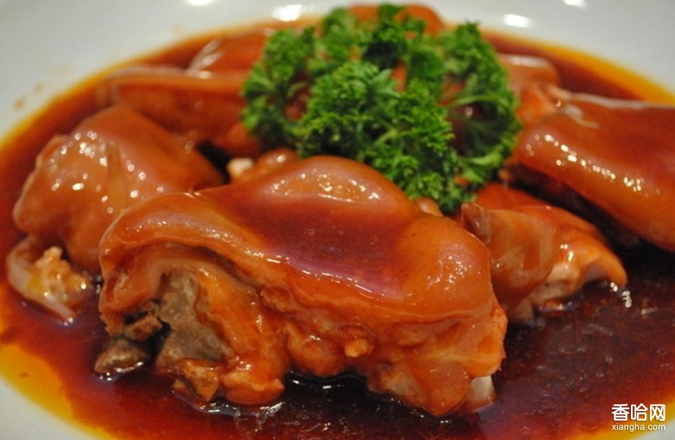 紅扒豬于是吉林傳統(tǒng)風味菜肴之一 , 此菜豬手經(jīng)烤、炸、燒等烹調(diào)方法制成 , 色澤紅亮 , 軟爛脫骨 , 柔韌醇香 , 濃而不膩。