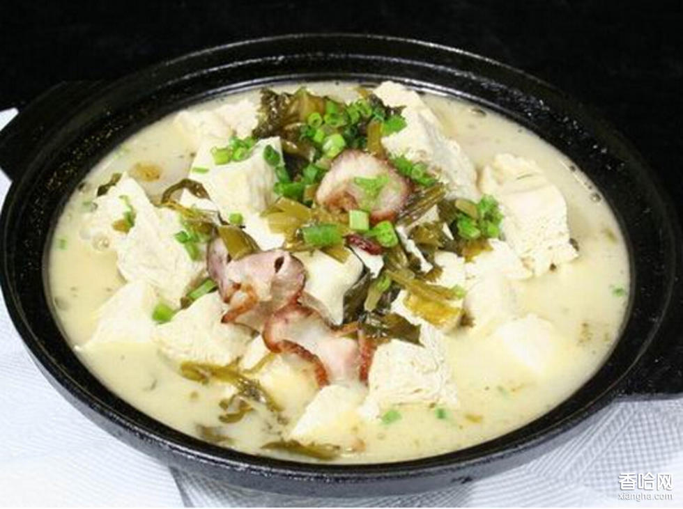 制作方法:1.將腌雪里蕻洗凈切成末;豆腐切成1.5厘米見方的塊,放入開水鍋內(nèi)燙一下,撈出涼水浸涼,控凈水分待用。2.將炒鍋置于火上,放入豬油,熱后下入蔥,姜末熗鍋,隨后放雪里蕻炒出香味,下入豆腐,添水沒過豆腐,加入精鹽,在旺火上燒開后,用微火燉5分鐘,待豆腐入味,湯汁不多時(shí),加入味精即成。