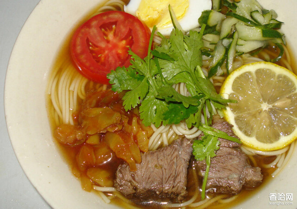朝鮮冷面(俗稱朝鮮面) 是馳名國內(nèi)外的一種深受人們喜歡的傳統(tǒng)民族食品。其中尤以蕎麥面冷面為著稱。一般用牛肉湯或雞湯,佐以辣白菜、肉片、雞蛋、黃瓜絲、梨條、蔥絲、辣椒、味精、鹽等。食用時(shí),先在碗內(nèi)放少量涼湯與適量面條,再放入佐料,最后再次澆湯。其面條細(xì)質(zhì)韌,湯汁涼爽,酸辣適口。正宗的朝鮮水冷面一般在夏天食用。朝鮮冷面多用碗食用,亦有用碟子盛裝的,但冷面的湯就相對較少了。冷面的作法,是把面條煮熟后,用涼水抄干后的面條,再放進(jìn)鹽、醋、醬油等調(diào)味料,并再加番茄、黃瓜等青菜作伴菜。吃時(shí)把伴菜與面條拌好,再配以朝鮮咸菜或泡菜,即可食用。調(diào)料方面,一般都采用朝鮮辣醬,但亦有用芥末醬的。俗語說:“辣椒辣嘴,蒜辣心,芥末辣住鼻梁筋”。有傷風(fēng)感冒鼻塞時(shí),食用芥末可使鼻子立即暢通。