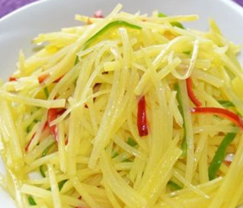 2、做法:準備食材。將去皮土豆切成薄片,然后再切成細絲。反復(fù)用水沖一下,洗去土豆絲表層的淀粉。將洗后的土豆絲撈出瀝水備用。青椒去蒂去籽去掉辣筋。將青椒切成細絲,蔥蒜切片備用。鍋中放適量油,加入花椒一起燒熱。加入蒜片蔥花一起炸香。蔥與蒜片呈現(xiàn)金黃色時與花椒一起撈出,只留鍋中的油。放入土豆絲。快速翻炒至略透亮,加入青椒絲??焖俜矗稳肷僭S白醋。加入適量鹽再次快速翻勻。關(guān)火后,加入少許雞精調(diào)味道翻勻即可。