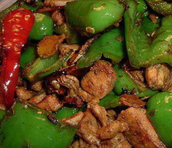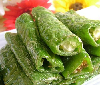(2)鍋留底油,下入炸好的青椒,調(diào)入精鹽、醋、味精等炒勻,起鍋裝盤(pán)即成。