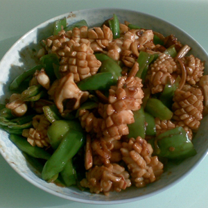 食材:新鮮魷魚、青椒、料酒、蔥、蒜、鹽、味精、生抽。