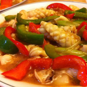 青椒炒魷魚是一道精致可口的菜肴,其口感肥而不膩、入口即化。