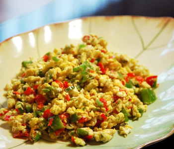 3)青紅椒翻炒出香味后下打好的蛋液,蛋液凝固后用鏟子炒碎即可出鍋。