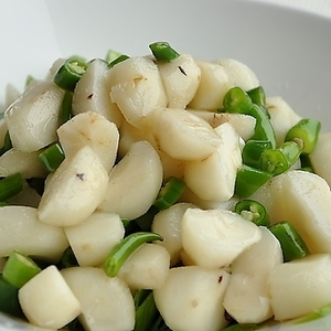 選用新鮮的荸薺,挑出爛果、裂果。將荸薺用清水沖洗干凈后,去掉外皮和邊芽。