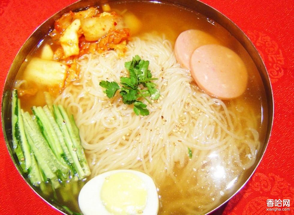 冷面亦稱股細(xì)和涼淘,是朝鮮和韓國及中國東北朝鮮族的傳統(tǒng)食品,在風(fēng)味及用料和制作工藝上主要分平壤冷面和首爾冷面,是用蕎麥面或小麥面(也有用玉米面、高粱米面、大米面、榆樹皮面的)加淀粉加水拌勻,壓成圓面條,煮熟后浸以冷水,再去冷水伴牛肉片、辣椒、泡菜、梨或蘋果片、醬醋、香油、香菜、黃瓜、水蘿卜片等佐料,加入牛肉湯即成。