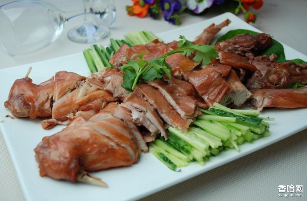 熏兔,是用茶葉、食糖、鍋巴、生姜、大蔥、八角(也有用鋸木屑、松柏枝)等20余種佐料作熏米,經(jīng)加熱使熏料焦糊產(chǎn)生濃煙,從而使原料外部脫水成熟的一種方法。其特點是,外焦里嫩,香味濃郁,松軟可口,回味無窮。