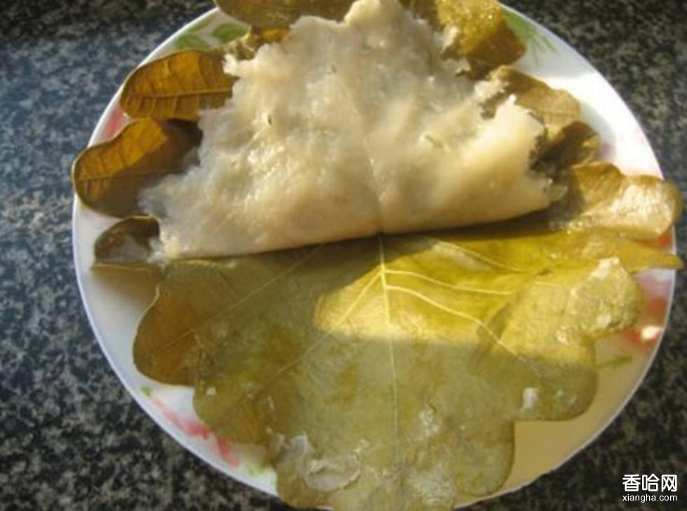 所謂玻璃葉其實就是柞樹葉,把面糊抹在柞樹葉上,放上餡,然后合在一起蒸熟,就是玻璃葉餅(有的地