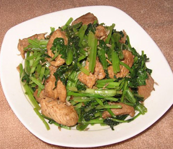 3、香菜根炒牛肉。香菜根洗凈,牛肉切絲,油熱后依次放入蒜末、蔥花、肉絲爆炒,而后放入香菜根,加入鹽、味精、香油、紅油,裝盤食用。