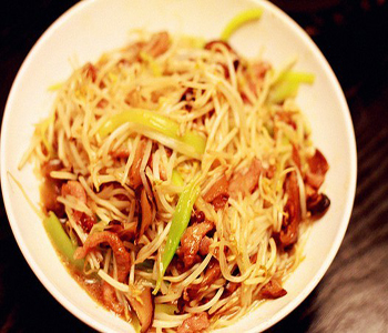 材料準備妥當以后就可以開始做了。先將綠豆芽摘去根,洗干凈,控去水分。再把豬肉切成絲。在鍋內(nèi)倒入底油,燒到8成熱,下入肉絲均勻煸炒,再加入醬油、料酒、白糖翻炒均勻。待肉絲微卷,即可盛出。接下來另起一個鍋,鍋內(nèi)放油,燒熱,先放入精鹽,隨即把綠豆芽倒入。待豆芽炒至半熟時,將肉絲倒入,炒到豆芽熟了,即可出鍋。