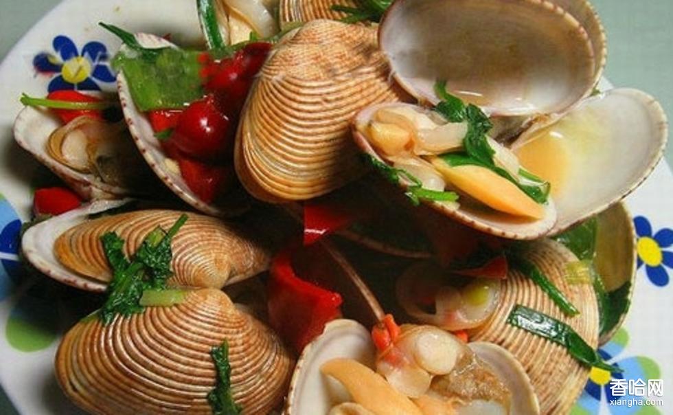原料:文蛤1000克、蘆葦300克、 紅綠尖椒20克、蔥段10克;