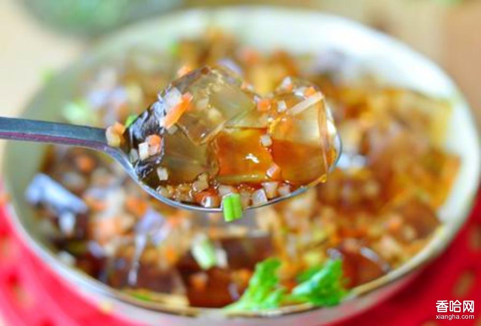 海涼粉,是大連的一種特色美食,原料是生長(zhǎng)在海底礁石上的一種水草叫牛毛菜,將它曬干后上鍋熬7—8小時(shí),再過(guò)濾、晾涼后切成條形便成海涼粉。
