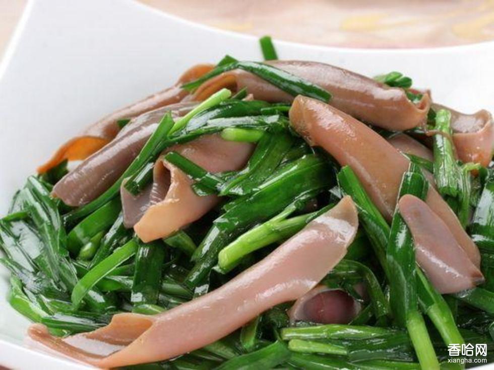 ③炒鍋入少許油,油溫八成熱,入海腸爆炒至七成熟時(shí)放入韭菜,大火爆炒,用精鹽、雞精調(diào)好味即可起鍋。