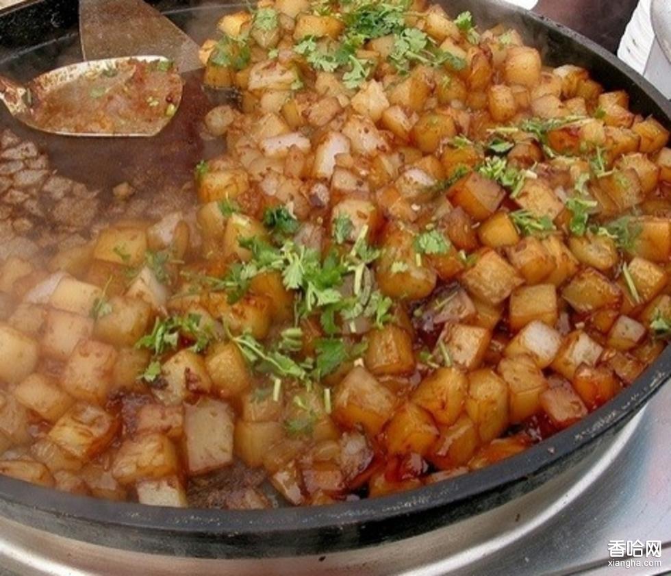 粘火勺的做法也不算費(fèi)事,因其是粘食,故制作用料要選用粘玉米、粘大米和大黃米之類,用上述同樣方法磨成水面,去掉雜質(zhì),即可備用烙制粘火勺了。其餡將選用精品小豆煮熟搗碎,烙制時(shí),可將燒熱的鐵鍋邊壁上擦油少許(以防嘎巴鍋),再用備好的粘米面包上豆餡拍成小餅狀,貼在鍋里烙制而成。