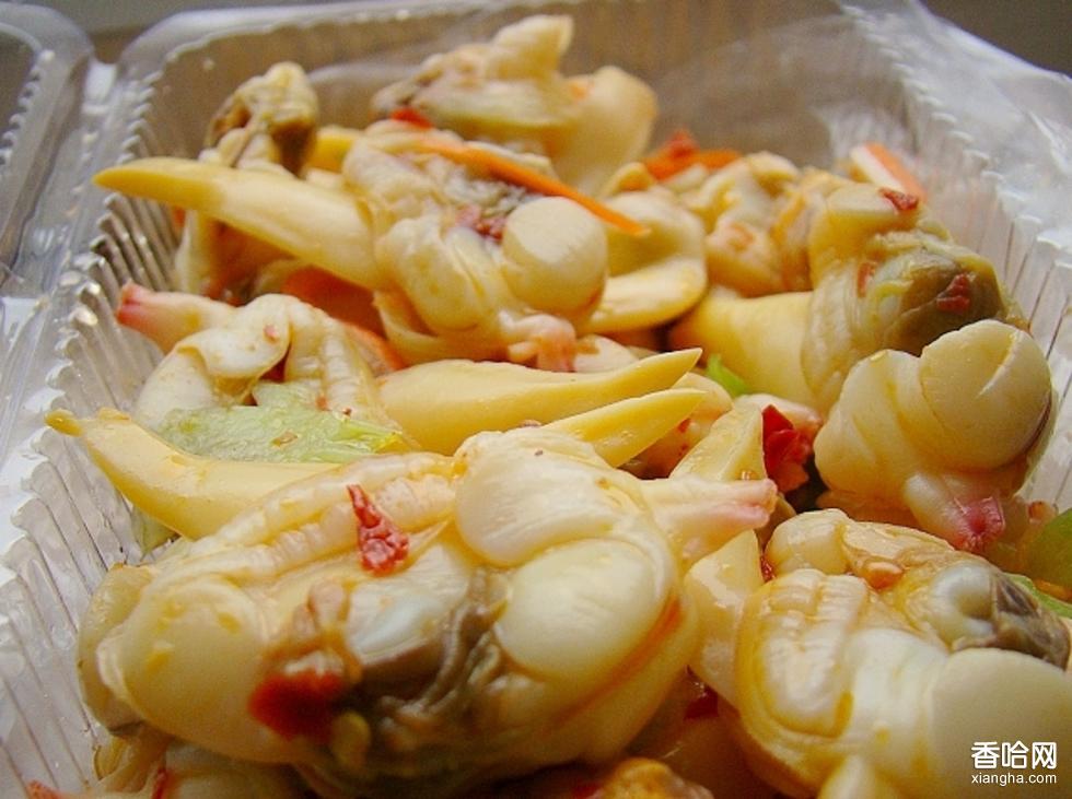 涼拌黃蜆子主料是凈鮮黃蜆子,配料是韭青,調(diào)料是醬油、芥茉、香油。將鮮蜆子洗凈,用開水燙至開口時(shí)撈出;把蜆子肉取出,再用清水洗凈,瀝干水分待用。韭青洗凈,放入開水內(nèi)燙透,用涼水淘涼取出,控凈水分裝盤。上面放蜆子肉,用以上調(diào)料兌好的汁,澆上即成。